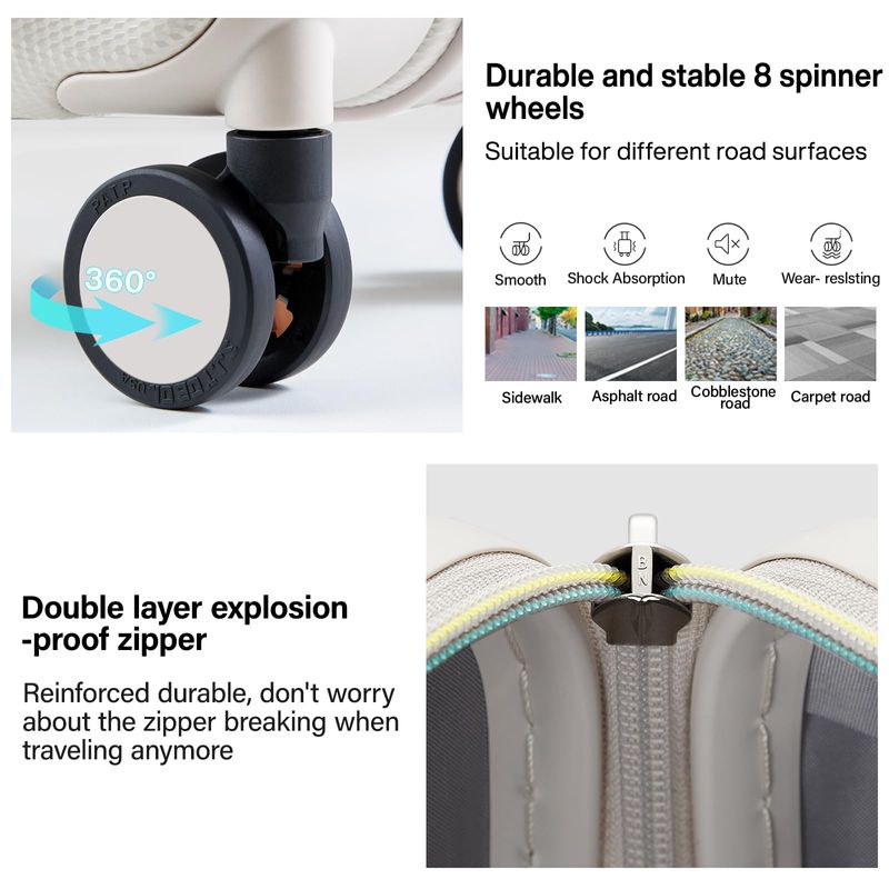 Actualización de accesorios: la piel gruesa de la rueda de TPE hace que la rueda giratoria sea más silenciosa y resistente al desgaste y duradera; la bobina inversa con cremallera YKK suave y resistente evita la ráfaga; el bloqueo de combinación aprobado por la TSA es seguro y conveniente; mango telescópico ergonómico con ajuste de varios pasos.
