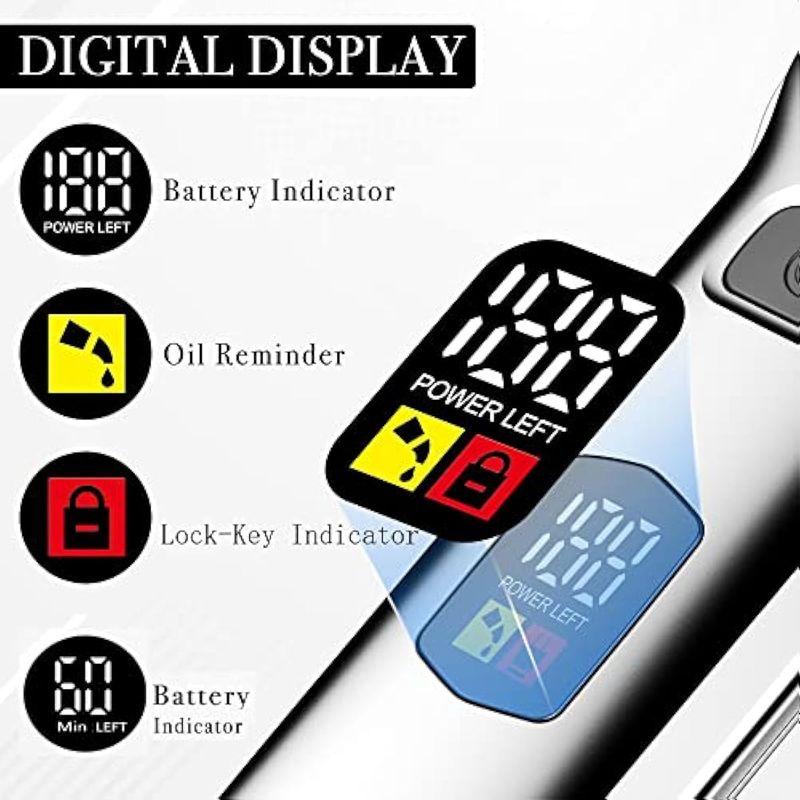 Pantalla LCD para cortadora de pelo grande: la potencia se muestra en porcentaje 0-100, lo que te pide que cargues a tiempo, limpieza y símbolo de bloqueo. Mantenga presionado durante 3 segundos para bloquear la máquina, y lo mismo es cierto para el desbloqueo.