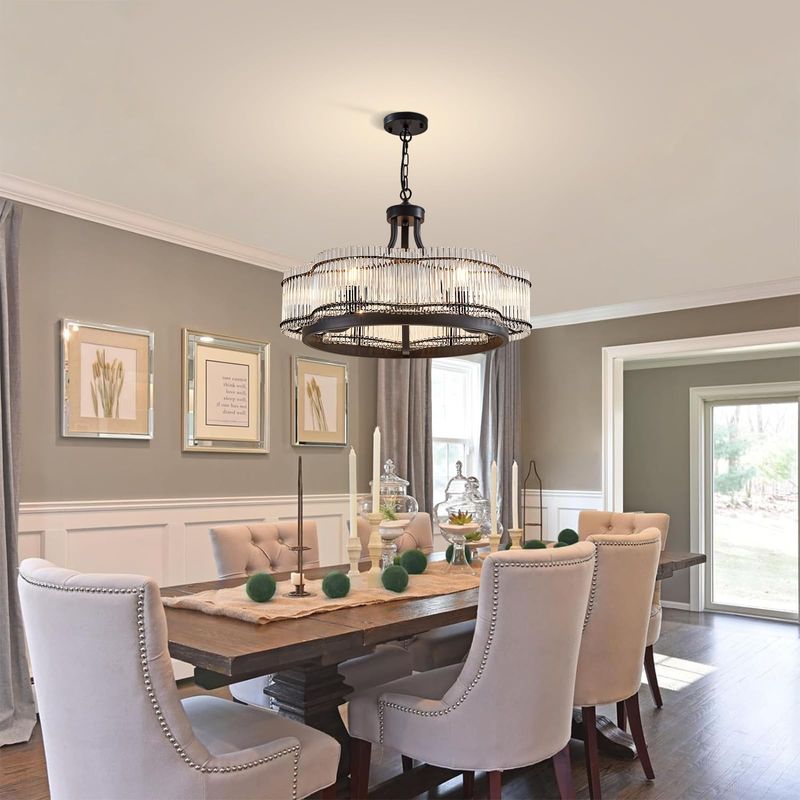 Diseño impresionante: la lámpara de comedor está diseñada con un cuerpo de rueda de vagón con acabado negro mate y 6 pantallas de vidrio transparente. Representa perfectamente el estilo de granja moderno y vintage. Se adapta a muchas áreas del hogar, como comedor, isla de cocina, sala de estar, dormitorio, entrada, vestíbulo y escalera.