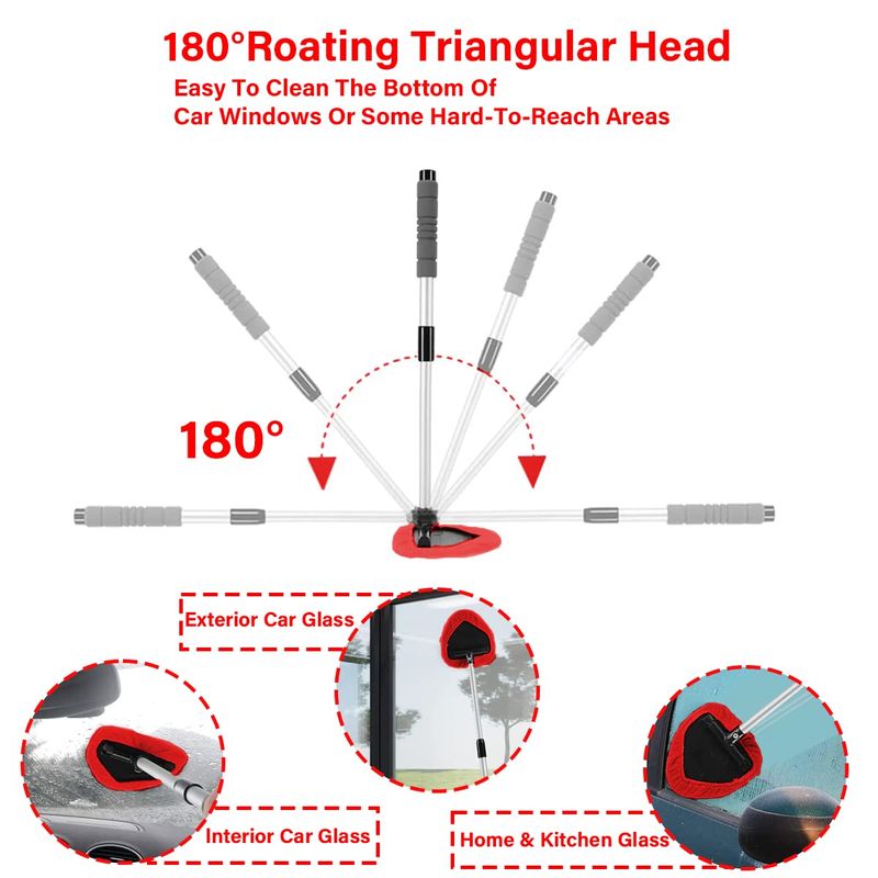 ?Extensible y giratorio de 180°?: la longitud de la varilla extensible es de 13.4 in cuando está cerrada y 19.3 in cuando está extendida. Esto amplía enormemente el área de limpieza, y puede fregar en el techo del automóvil u otros lugares altos sin mucho esfuerzo. Además, la cabeza triangular gira libremente 180 grados, puede ser muy flexible para limpiar en aquellas áreas de difícil acceso.