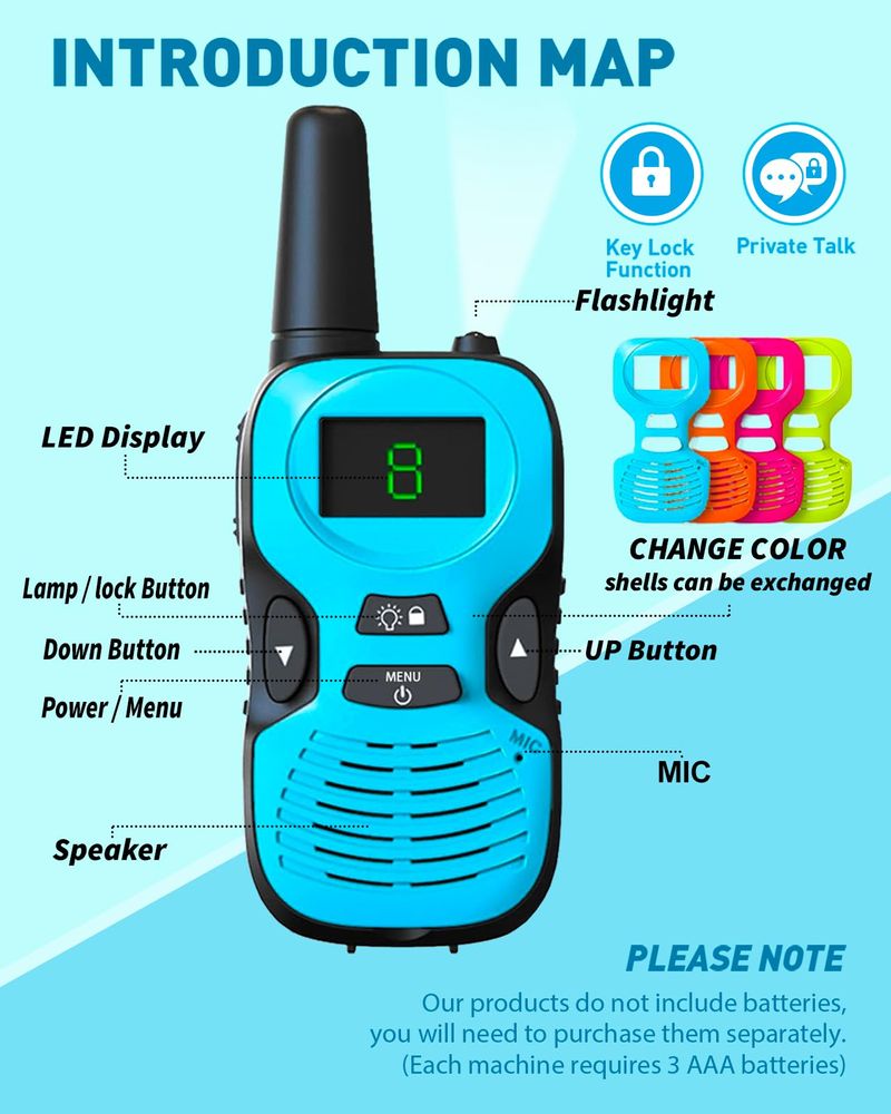 Power chip upgrade: Infrequent use, the kids walkie talkies is powered on for a long time when it is turned off. The kids walkie talkies can be used for about a week when it is always on. You can also buy rechargeable batteries and cables to save you some money.