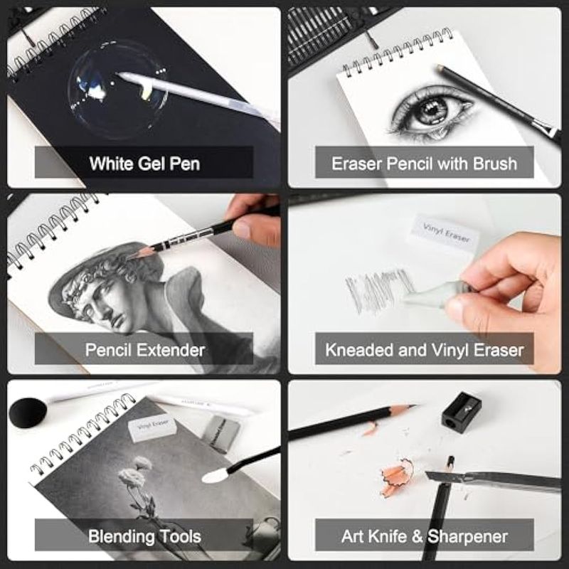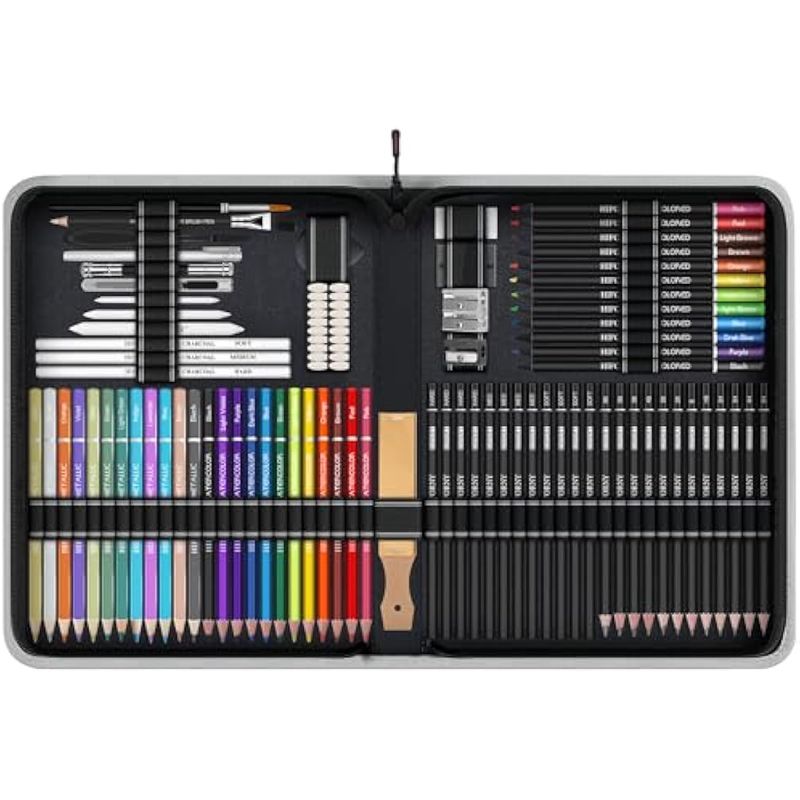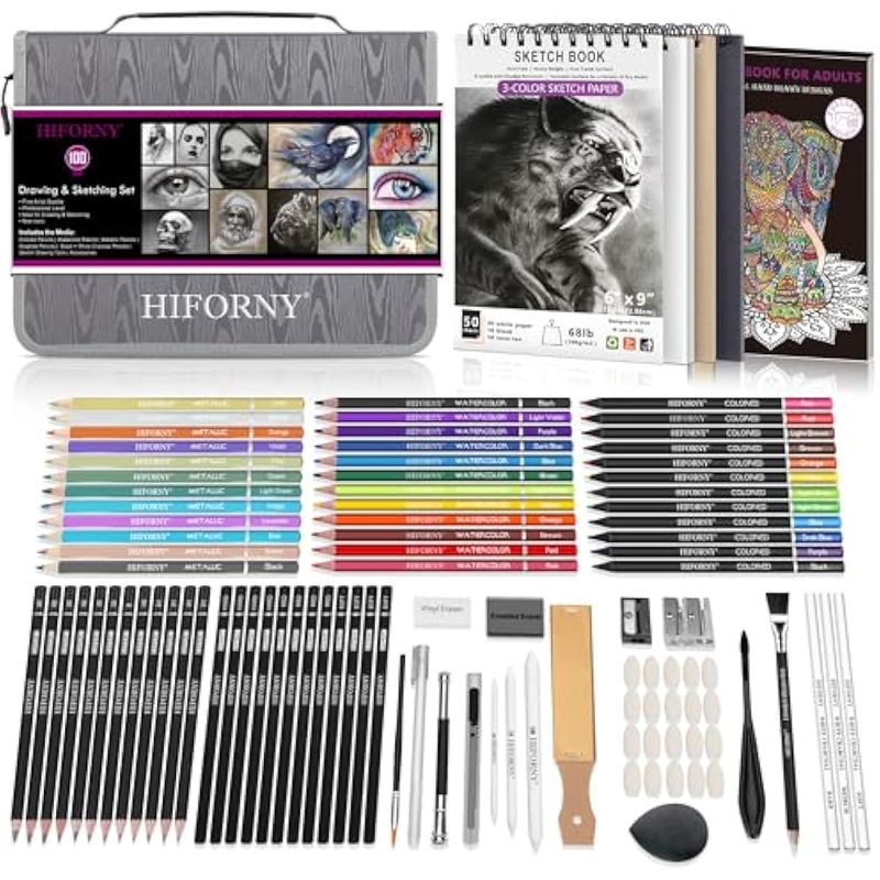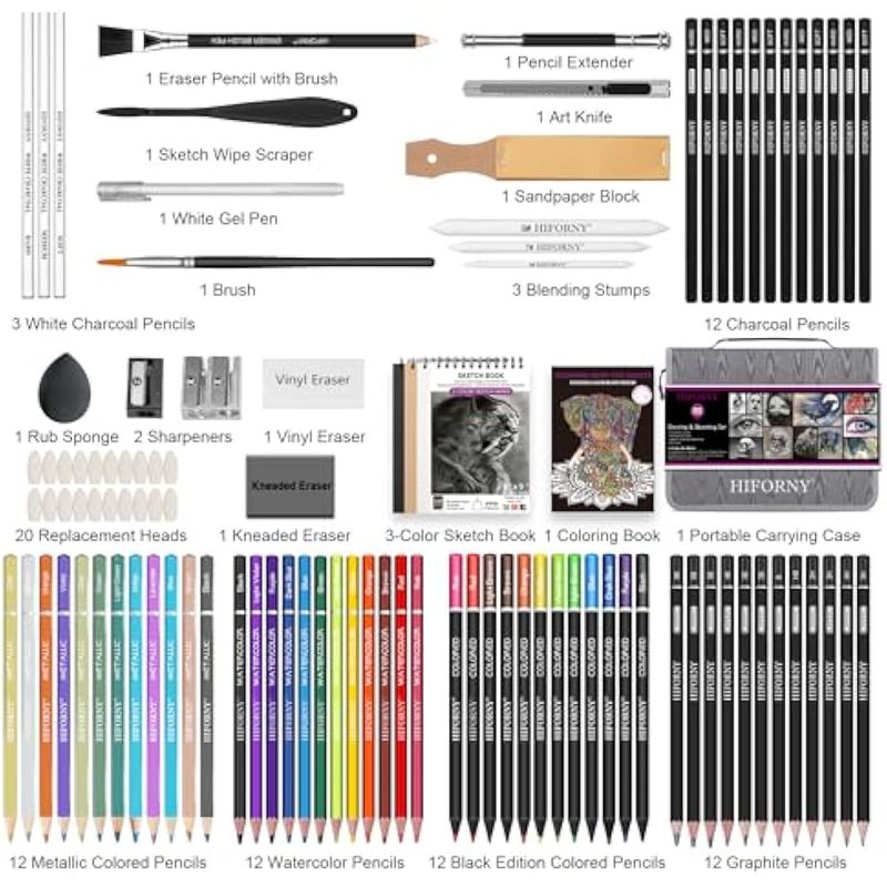 HIFORNY Juego de 100 piezas de dibujo y bocetos, suministros de arte profesionales con grafito,
