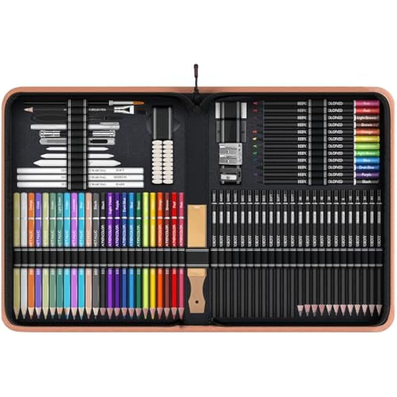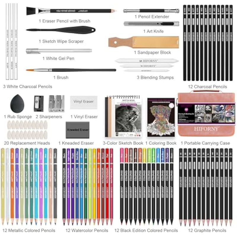HIFORNY Juego de 100 piezas de dibujo y bocetos, suministros de arte profesionales con grafito,