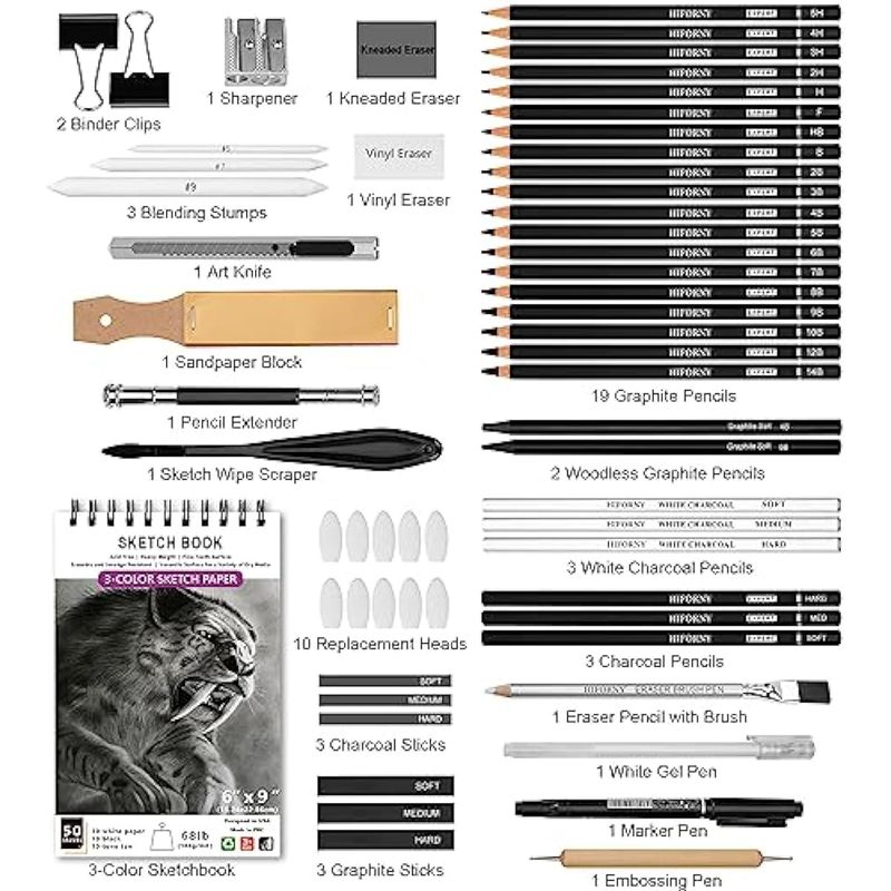 ARTE, LIBRERÍA Y OFICINAMATERIALES DE ARTEHIFORNY Juego de 60 lápices de dibujo, lápices de bocetos, suministros de arte con cuaderno de