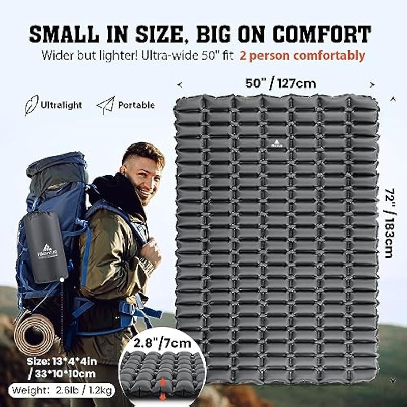 Lleva comodidad como una cama al aire libre: acampar con tus seres queridos, familiares o amigos es una excelente manera de relajarse. Comienza tu viaje inolvidable con la colchoneta doble Hikenture para dormir, mide 72 pulgadas de largo y 50 pulgadas de ancho para adaptarse cómodamente a dos personas, ofreciendo 2.8 pulgadas de apoyo grueso para dormir durante tus aventuras al aire libre.