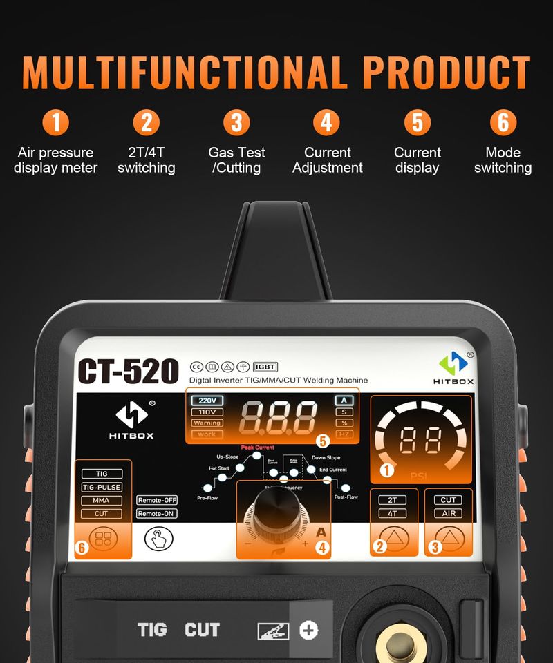 Pantalla digital LED y 2T4T: puedes ajustar el modo de corriente y corte de acuerdo con la pantalla digital LED y leer el valor de presión de aire más fácilmente. El corte por plasma tiene modos de corte semiautomáticos y automáticos, y puede cambiar 2T4T a través de la pantalla de visualización para satisfacer sus necesidades y opciones.