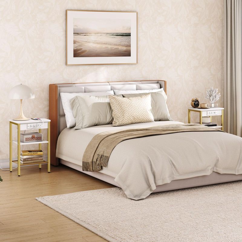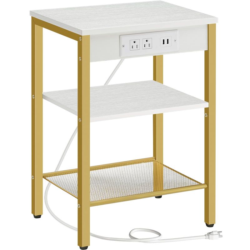 HOOBRO Mesa auxiliar con estación de carga y puertos USB, mesita de noche de 3 niveles con estante