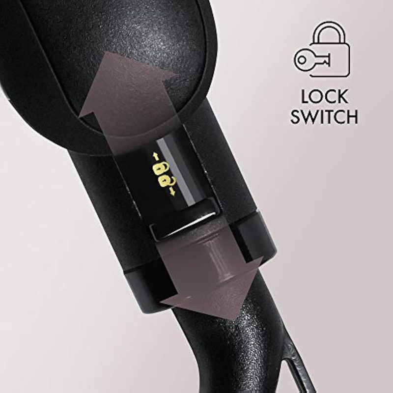 La plancha plana viene equipada con: apagado automático, interruptor de bloqueo, calentamiento de 30 segundos, botón de encendido de encendidoapagado, pantalla digital de temperatura, cable giratorio sin enredos de 6 pies
