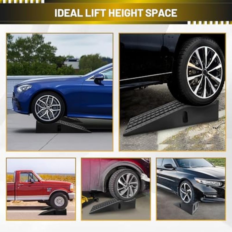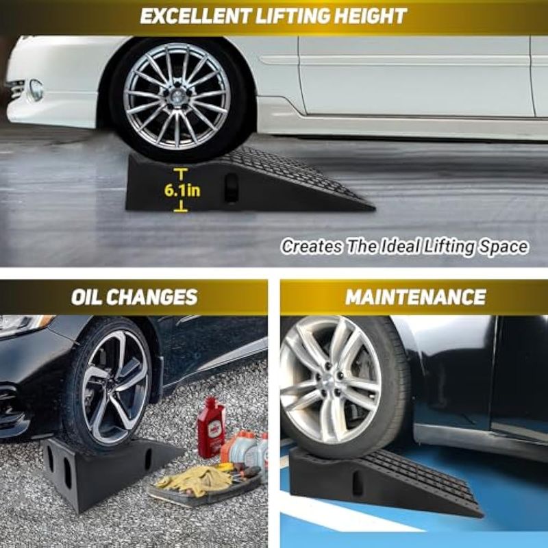 [ALTURA DE ELEVACIÓN MÁS ALTA]: Estas rampas para automóvil para cambios de aceite tienen una altura de elevación de 6.1 pulgadas, crean el espacio de elevación ideal para que puedas cambiar más eficazmente el aceite, el soporte de gato, reparar autos y otras operaciones, hacer el trabajo más fácil. GVW pesa 13,000 libras, cumple con el uso de camionetas, SUV, automóvil, camión ligero, vehículo agrícola ligero, adecuado para reparación del hogar y tienda de servicio automotriz profesional.