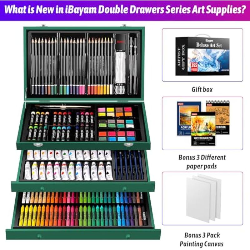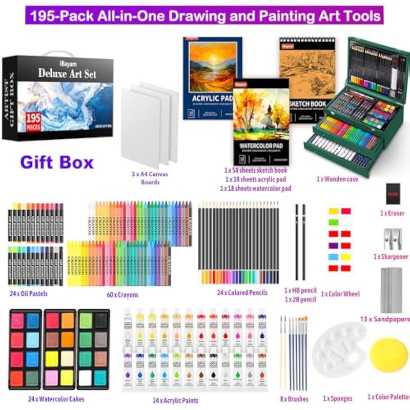 iBayam Juego de arte de lujo, paquete de 195 cajas de regalo para artistas, kit de pintura de dibujo