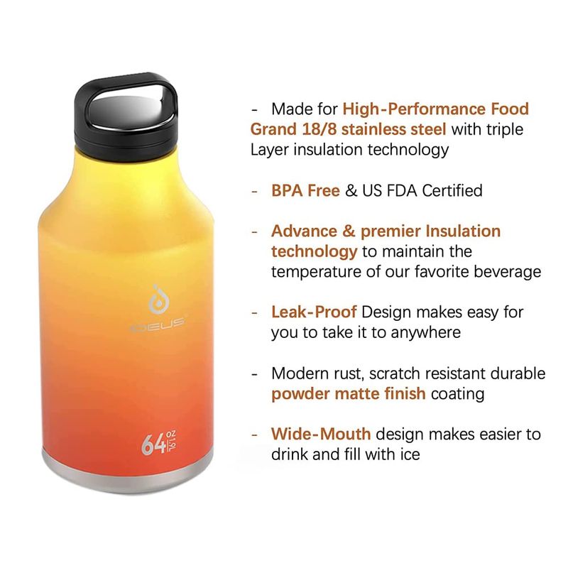 Botella de agua con aislamiento al vacío: la botella de agua deportiva Ideus está hecha de acero inoxidable de alto rendimiento de grado alimenticio que ayuda a que las botellas de agua recargables retengan el frío o el calor. El aislamiento eficaz con una tapa deportiva y tapa de asa ayuda a mantener la temperatura hasta 24 horas para el frío y 12 horas para bebidas calientes. Esta botella de agua reutilizable es segura y fácil de limpiar.