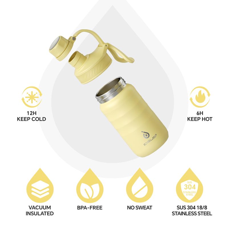 Botella de agua con aislamiento al vacío: la botella de agua deportiva Ideus está hecha de acero inoxidable de alto rendimiento de grado alimenticio que ayuda a que las botellas de agua recargables retengan el frío o el calor. El aislamiento eficaz con una tapa deportiva y tapa de asa ayuda a mantener la temperatura hasta 24 horas para el frío y 12 horas para bebidas calientes. Esta botella de agua reutilizable es segura y fácil de limpiar.