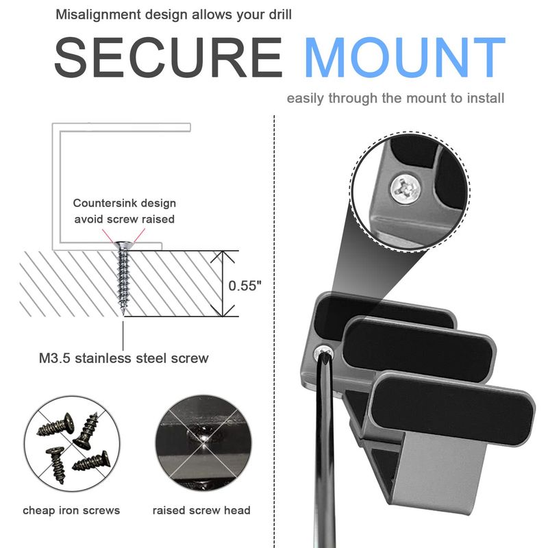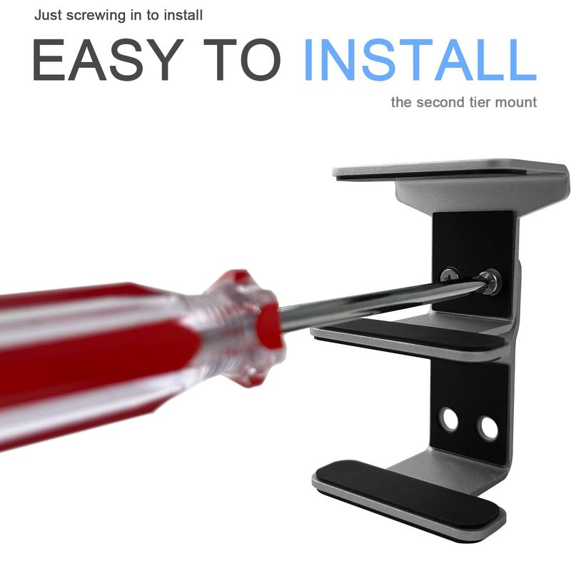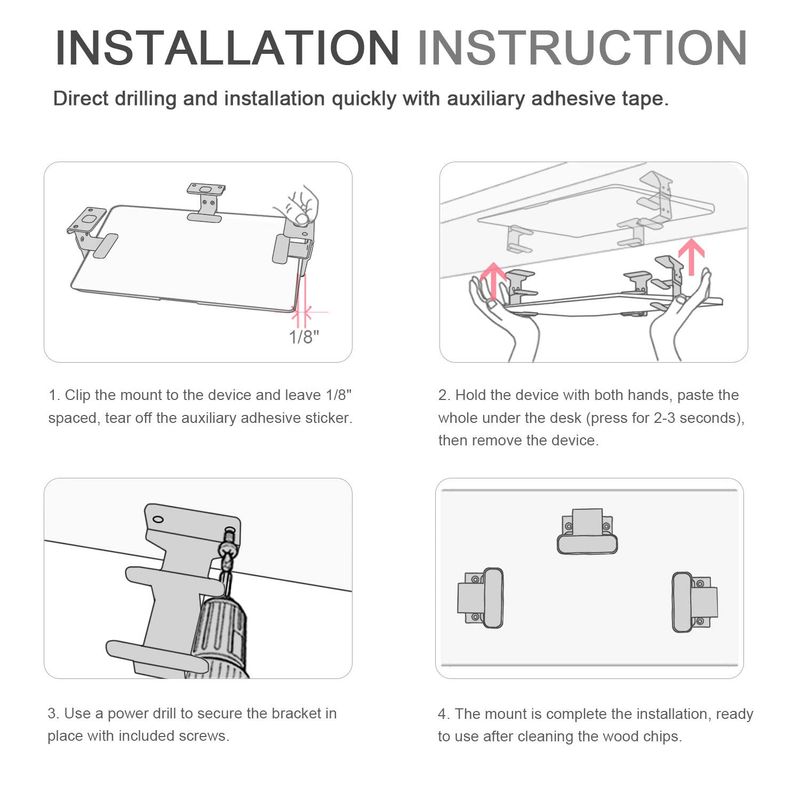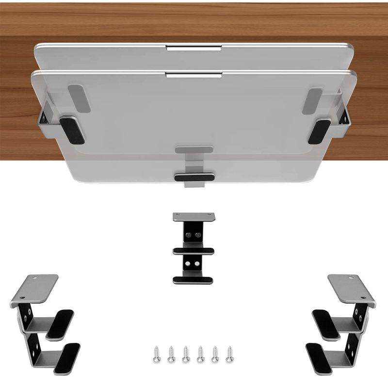 FÁCIL DE INSTALAR: Coloque la computadora portátil en el soporte y marque las ubicaciones de los soportes debajo del escritorio. Coloque cada soporte en las ubicaciones marcadas.Asegure cada soporte con tornillos. El diseño de desalineación en ambos lados permite que tu taladro pase fácilmente a través del soporte para instalar.