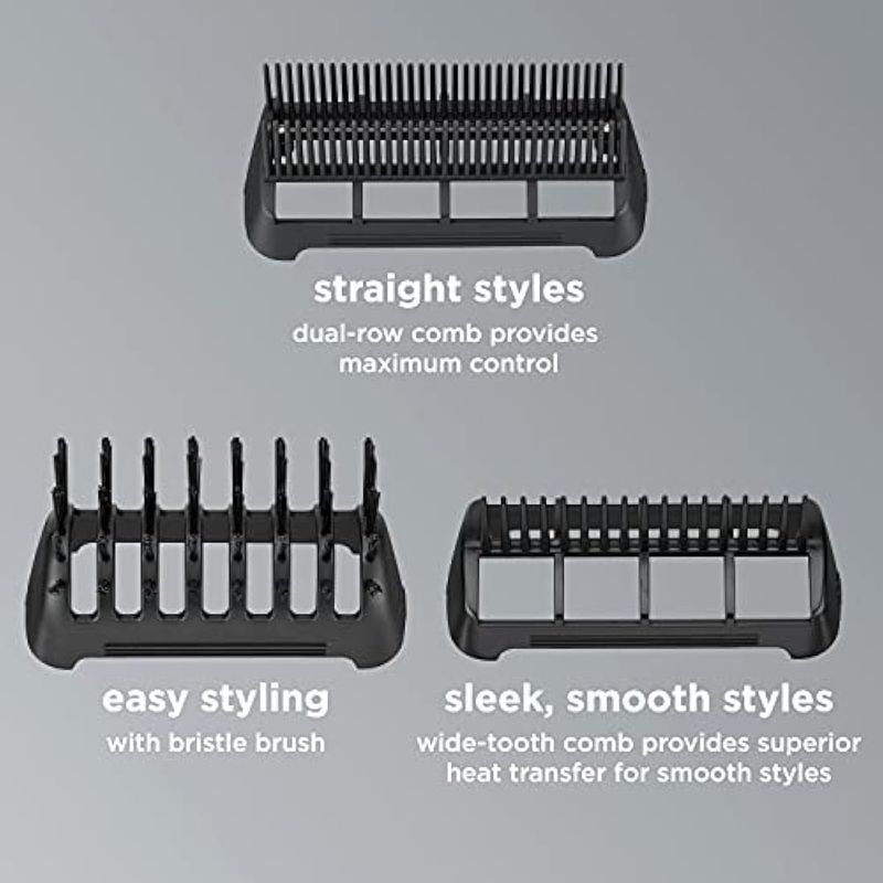 Uso versátil: incluye tres accesorios para una variedad de estilos y estilos: cepillo de cerdas, peine enderezador de doble fila y peine desenredante de dientes anchos; el botón de bloqueo mantiene los accesorios en su lugar mientras se peina