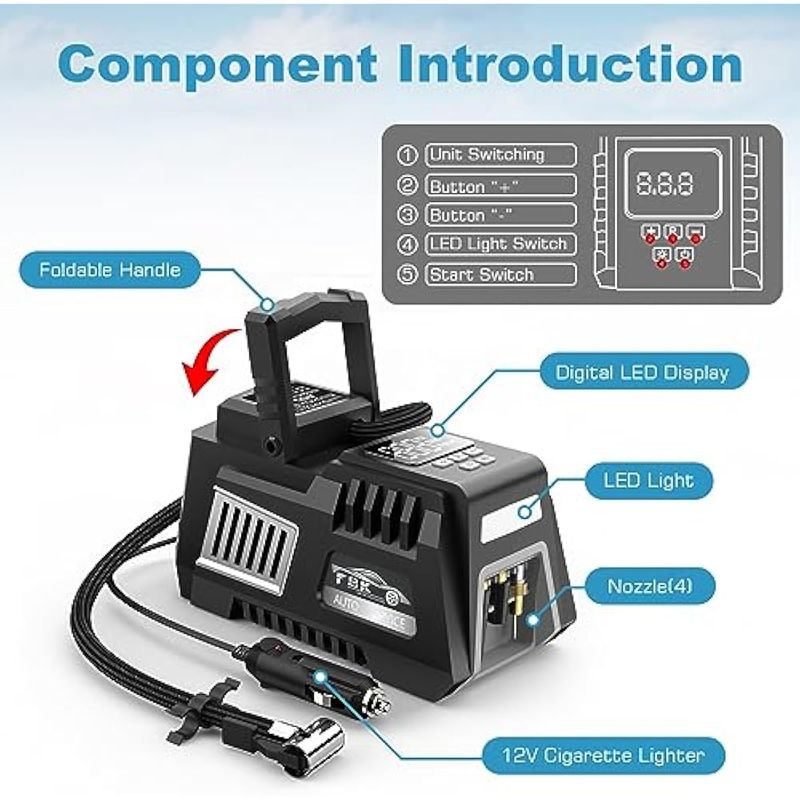 Pantalla digital e iluminación LED: El inflador de neumáticos está equipado con una gran pantalla de alta precisión y alto brillo para ayudarlo a verificar la presión de los neumáticos y preestablecer los valores de presión de los neumáticos. El medidor del compresor de aire puede mostrar la presión en PSI, BAR y KGCM². La bomba de aire está equipada con luces LED brillantes y duraderas, fáciles de usar incluso en la oscuridad.