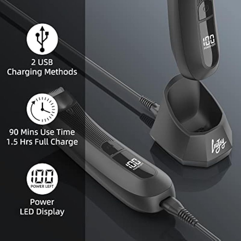Pantalla LED y carga rápida USB: mantente al tanto de tu rutina de aseo con la afeitadora eléctrica para hombres, viene con una pantalla LED incorporada que indica la energía de la batería y te recuerda cuándo es el momento de cargar. Con una batería recargable de iones de litio incorporada, este peluquero corporal puede ofrecer hasta 90 minutos de tiempo de funcionamiento por carga con solo aproximadamente 1.5 horas de tiempo de carga. Además, con la comodidad de la base USB de carga rápida, puedes cargar fácilmente tu afeitadora mientras estás en movimiento.