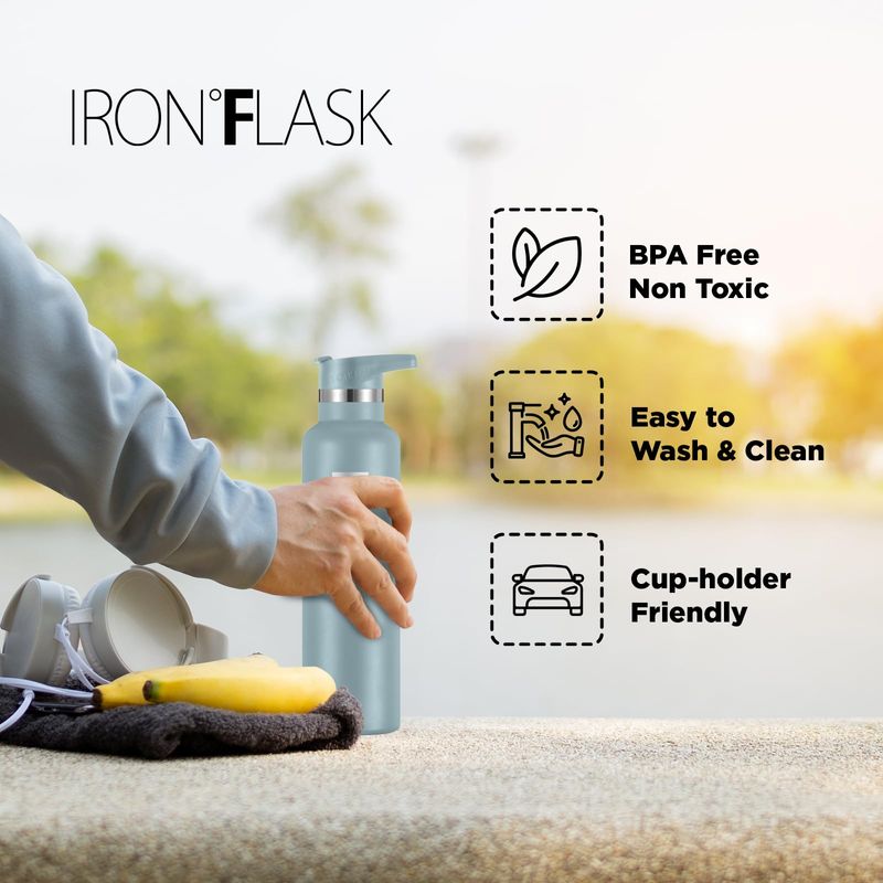 Botella de agua aislada para deportes: ¡Adiós a la condensación! El aislamiento de doble pared hace que la botella de Iron Flask no sude. Mantiene tu bebida fría hasta por 24 horas y caliente hasta por 12 horas. *Nota: Solo las botellas de 12, 16, 20 y 24 onzas caben en los portavasos.