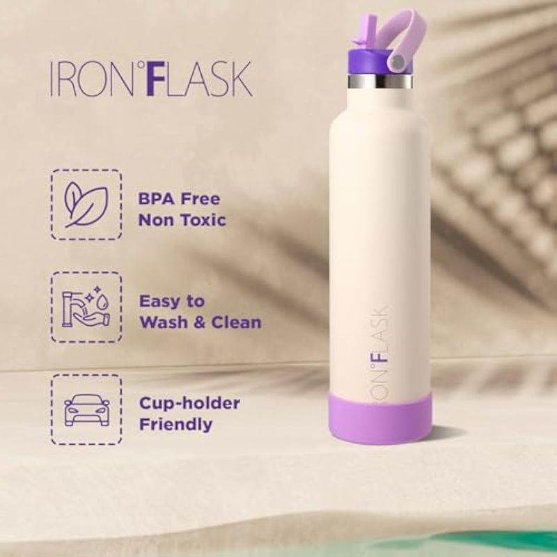 Botella de agua aislada para deportes: ¡Adiós a la condensación! El aislamiento de doble pared hace que la botella de Iron Flask no sude. Mantiene tu bebida fría hasta por 24 horas y caliente hasta por 12 horas. *Nota: Solo las botellas de 12, 16, 20 y 24 onzas caben en los portavasos.