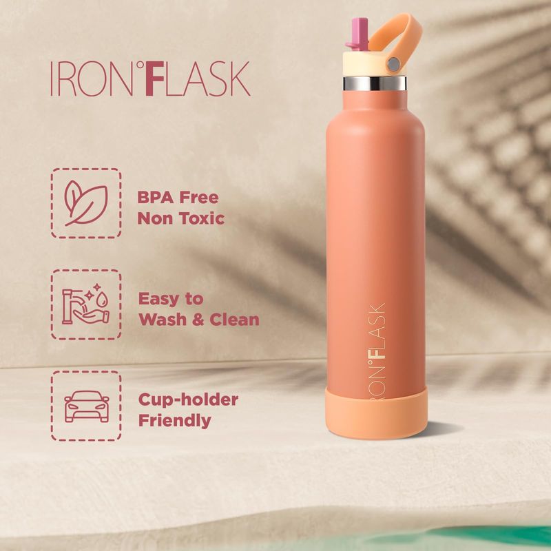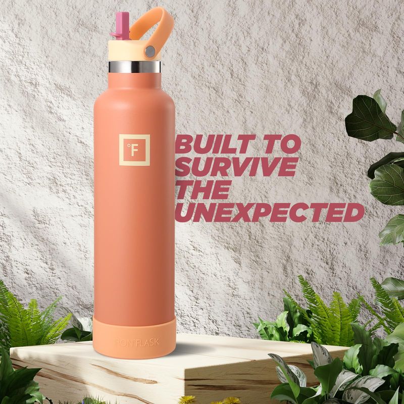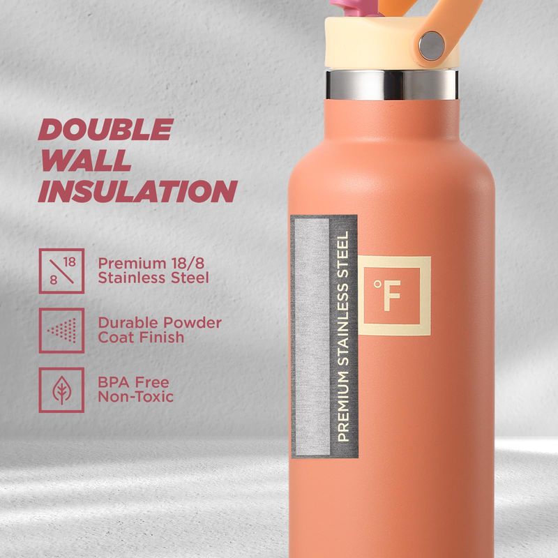 Botella de agua aislada para deportes: ¡Adiós a la condensación! El aislamiento de doble pared hace que la botella de Iron Flask no sude. Mantiene tu bebida fría hasta por 24 horas y caliente hasta por 12 horas. *Nota: Solo las botellas de 12, 16, 20 y 24 onzas caben en los portavasos.