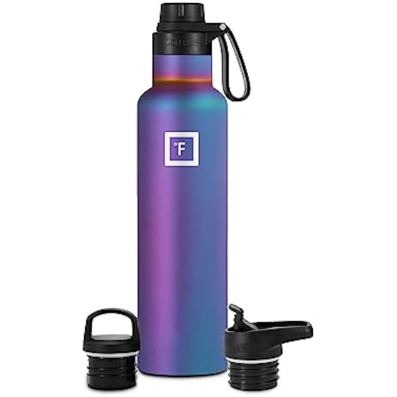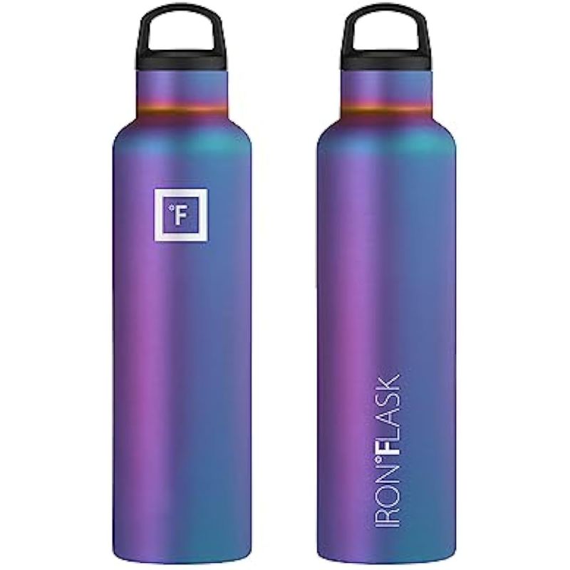 Botella de agua aislada para deportes: ¡Adiós a la condensación! El aislamiento de doble pared hace que la botella de Iron Flask no sude. Mantiene tu bebida fría hasta por 24 horas y caliente hasta por 12 horas. *Nota: Solo las botellas de 12, 16, 20 y 24 onzas caben en los portavasos.