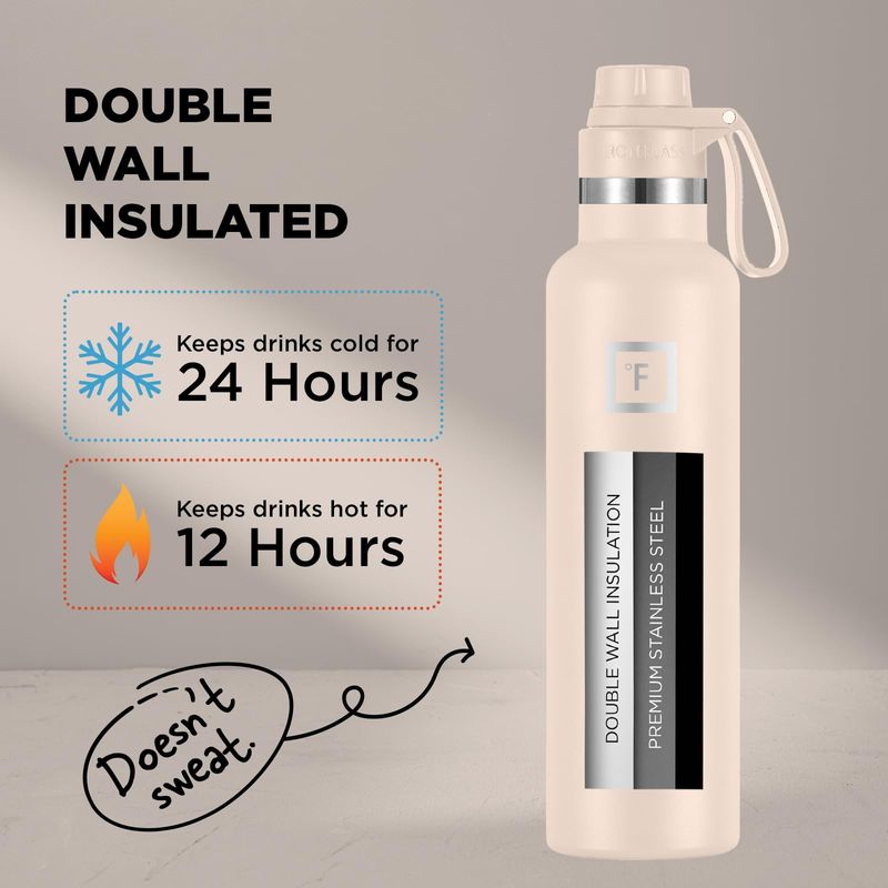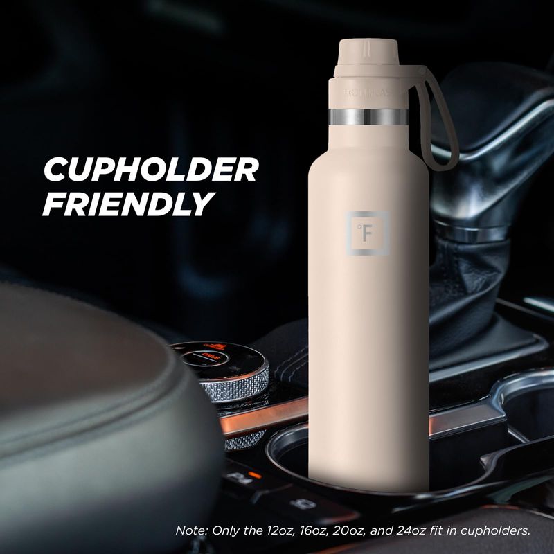 Botella de agua aislada para deportes: ¡Adiós a la condensación! El aislamiento de doble pared hace que la botella de Iron Flask no sude. Mantiene tu bebida fría hasta por 24 horas y caliente hasta por 12 horas. *Nota: Solo las botellas de 12, 16, 20 y 24 onzas caben en los portavasos.