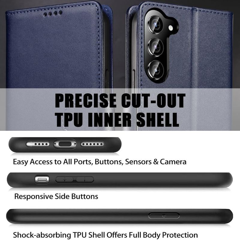 Cuero auténtico: la capa exterior de la funda para Samsung S23 está hecha de piel de vaca fragmentada auténtica, que es de cuero genuino. La carcasa interior está hecha de TPU de silicona de alta calidad, que puede envolver tu teléfono Galaxy S23 perfectamente, a prueba de golpes y duradero