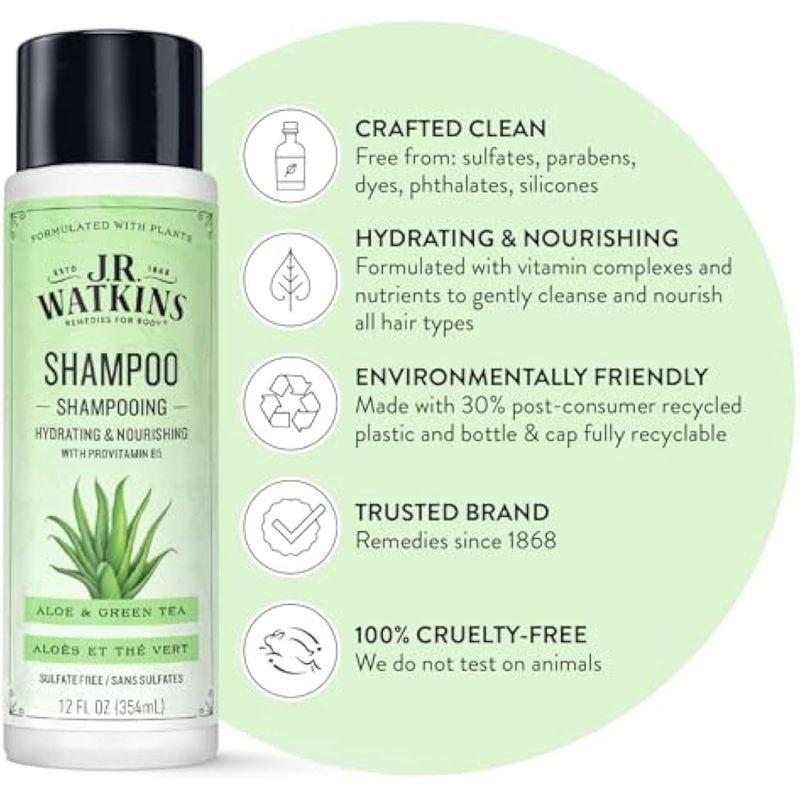 J.R. Watkins Champú de hidratación diaria, aloe y té verde, 12 onzas líquidas (paquete de 2)
