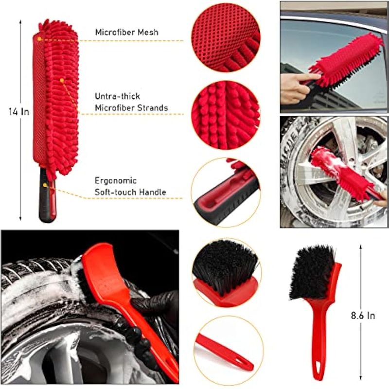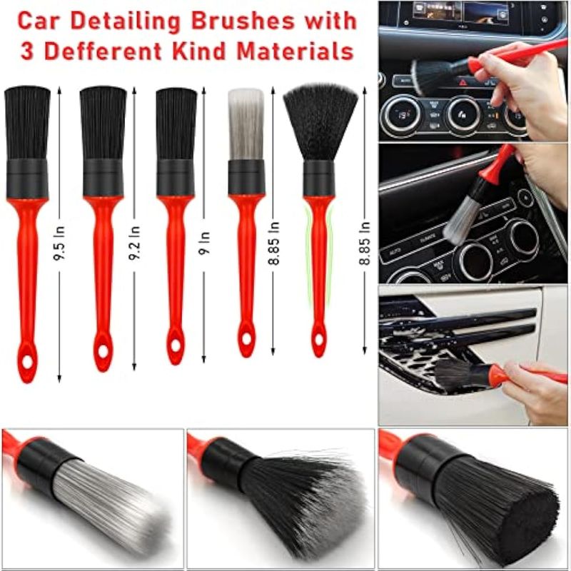 5 cepillos de detalles mejorados y 1 cepillo de ventilación para automóvil: el juego de cepillos de detalles tiene 3 cerdas de diferente suavidad. Las cerdas súper suaves son ideales para superficies delicadas como tablero, pantalla, asientos de cuero. El cepillo de cerdas grises está hecho de fibra sintética fina, perfecto para ordenar tanto el interior como el exterior del automóvil. Los cepillos de cerdas negras son resistentes y elásticos, adecuados para limpiar bahías del motor, ruedas, neumáticos, espacios estrechos o pequeños. El cepillo de ventilación del coche está diseñado ergonómicamente para eliminar el polvo de la ventilación, persianas, etc.