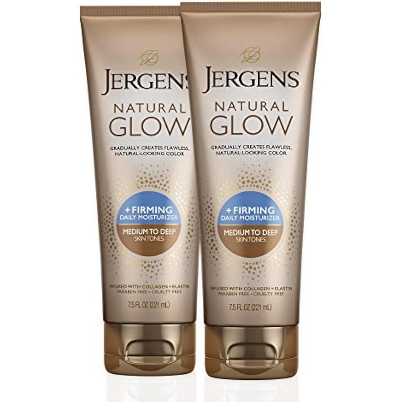 Jergens Natural Glow +FIRMING Loción corporal autobronceadora, tono de piel medio a bronceado, hidratante bronceador sin sol, con colágeno y elastina, ayuda a reducir visiblemente la celulitis, 7.5 onzas líquidas paquete de 2