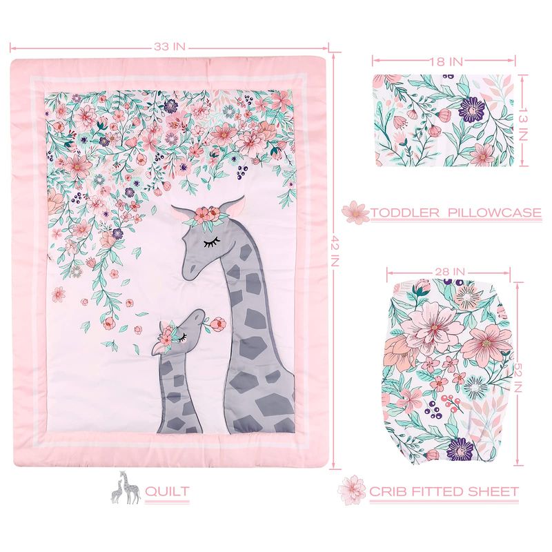 Juego de cama de cuna de 3 piezas: el juego de cama para cuna incluye un edredón 33 x 42 pulgadas con volantes de 2 pulgadas, una sábana bajera ajustable 52 x 28 pulgadas, una funda de almohada para niños pequeños 13 x 18 pulgadas, viene con una bolsa de embalaje reutilizable para almacenar cuando no se utilice. El juego de cuna se adapta perfectamente a cunas de tamaño estándar, un imprescindible para cada nuevo padre.