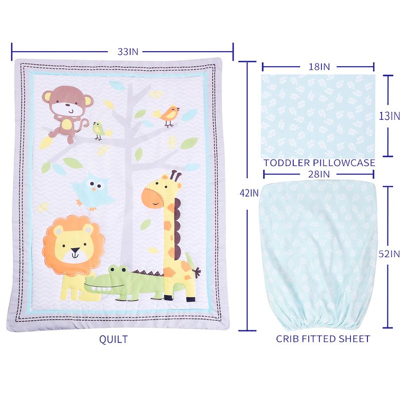 Juego de cama de cuna de 3 piezas: el juego de cama para cuna incluye un edredón 33 x 42 pulgadas con volantes de 2 pulgadas, una sábana bajera ajustable 52 x 28 pulgadas, una funda de almohada para niños pequeños 13 x 18 pulgadas, viene con una bolsa de embalaje reutilizable para almacenar cuando no se utilice. El juego de cuna se adapta perfectamente a cunas de tamaño estándar, un imprescindible para cada nuevo padre.