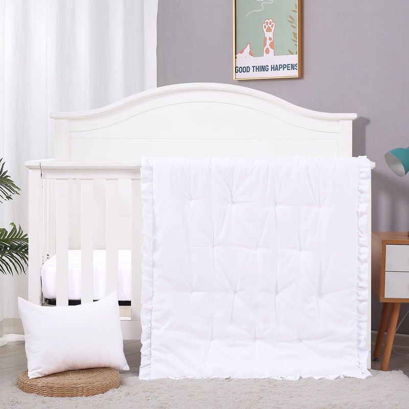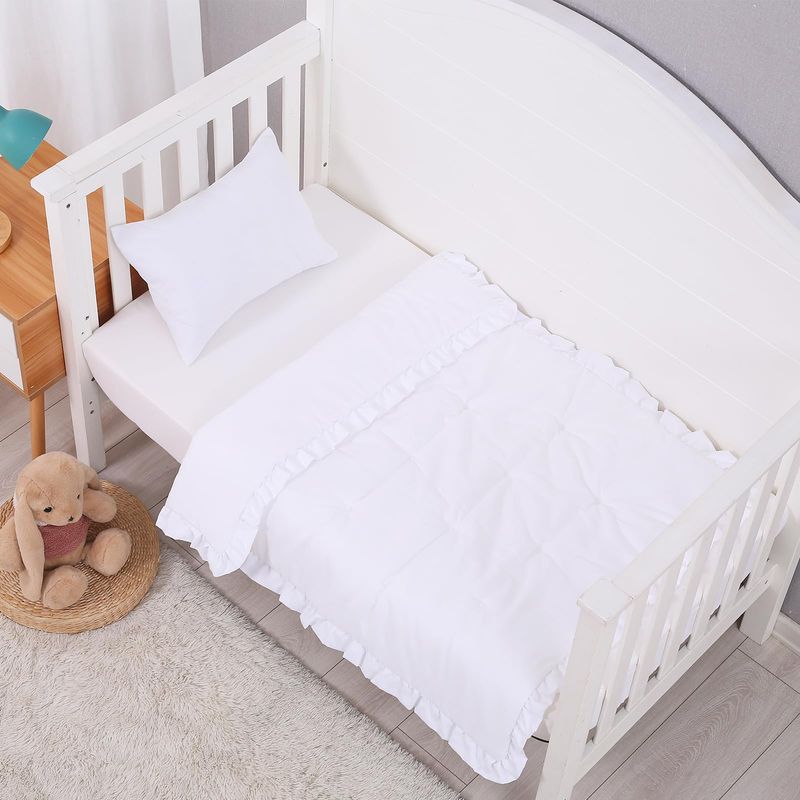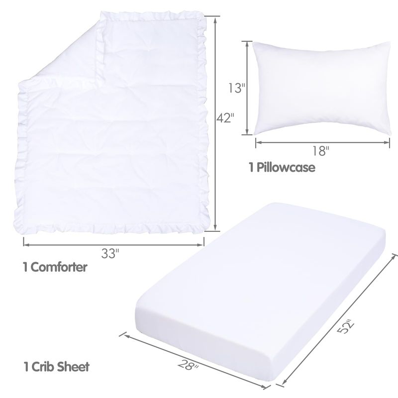 Juego de cama de cuna de 3 piezas: el juego de cama para cuna incluye un edredón 33 x 42 pulgadas con volantes de 2 pulgadas, una sábana bajera ajustable 52 x 28 pulgadas, una funda de almohada para niños pequeños 13 x 18 pulgadas, viene con una bolsa de embalaje reutilizable para almacenar cuando no se utilice. El juego de cuna se adapta perfectamente a cunas de tamaño estándar, un imprescindible para cada nuevo padre.