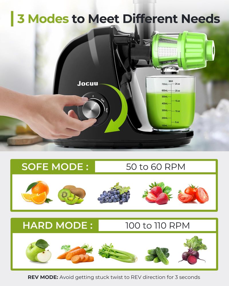 JOCUU EXPRIMIDOR DE MASTICACIóN LENTA CON MODOS DE 2 VELOCIDADES, MáQUINA EXPRIMIDORA DE PRENSA EN FRíO, MOTOR SILENCIOSO Y FUNCIóN DE MARCHA ATRáS, EXTRACTOR DE EXPRIMIDOR FáCIL DE LIMPIAR, RECETAS