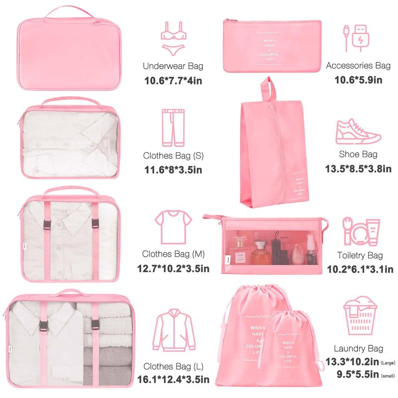 ?8 cubos de embalaje de compresión?Nuestro juego de bolsas organizadoras de maletas viene en varios tamaños para adaptarse a todos tus artículos esenciales, desde ropa y zapatos hasta cosméticos y electrónica. El organizador de bolsas de viaje para equipaje hace que cualquier cosa sea organizada