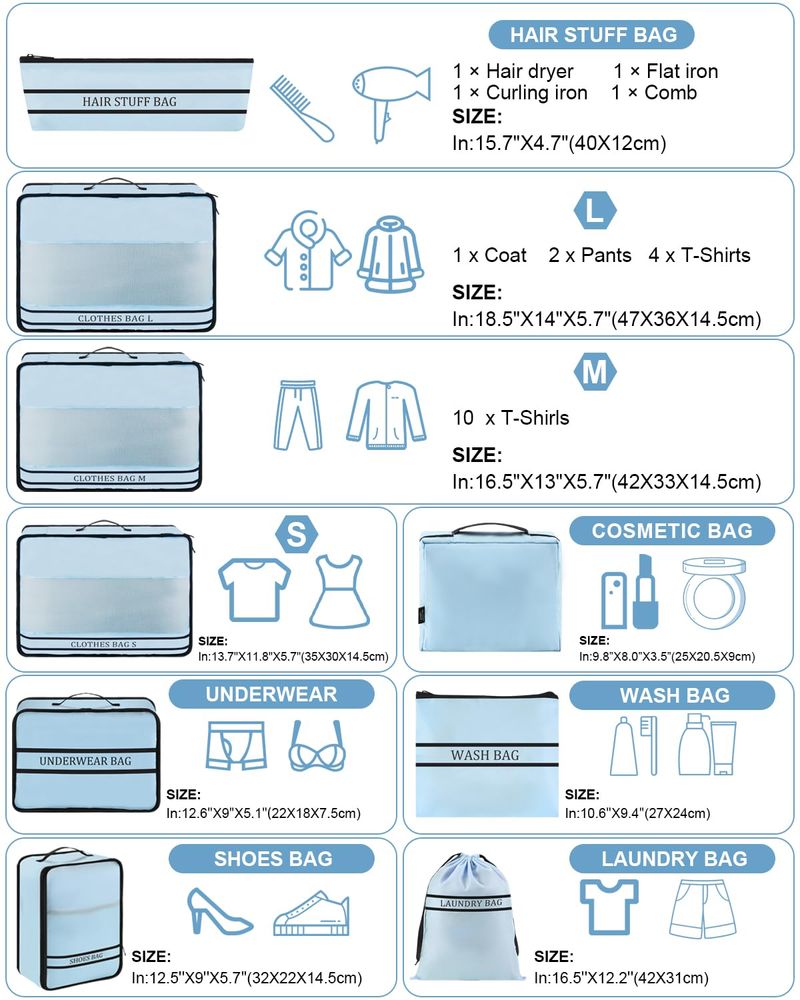 Los cubos de embalaje para mujer: 3 cubos de embalaje de diferentes tamaños, 1 bolsa de ropa interior, 1 bolsa de artículos de tocador, 1 bolsa de lavandería con cordón, 1 bolsa de zapatos puede contener 2 pares de zapatos, 1 bolsa impermeable con cremallera, 1 bolsa para cosas para el cabello. Un accesorio de viaje imprescindible. Ideal para estilos de vida activos, incluyendo viajes, mochileros, camping, gimnasio, playa o almacenamiento diario.