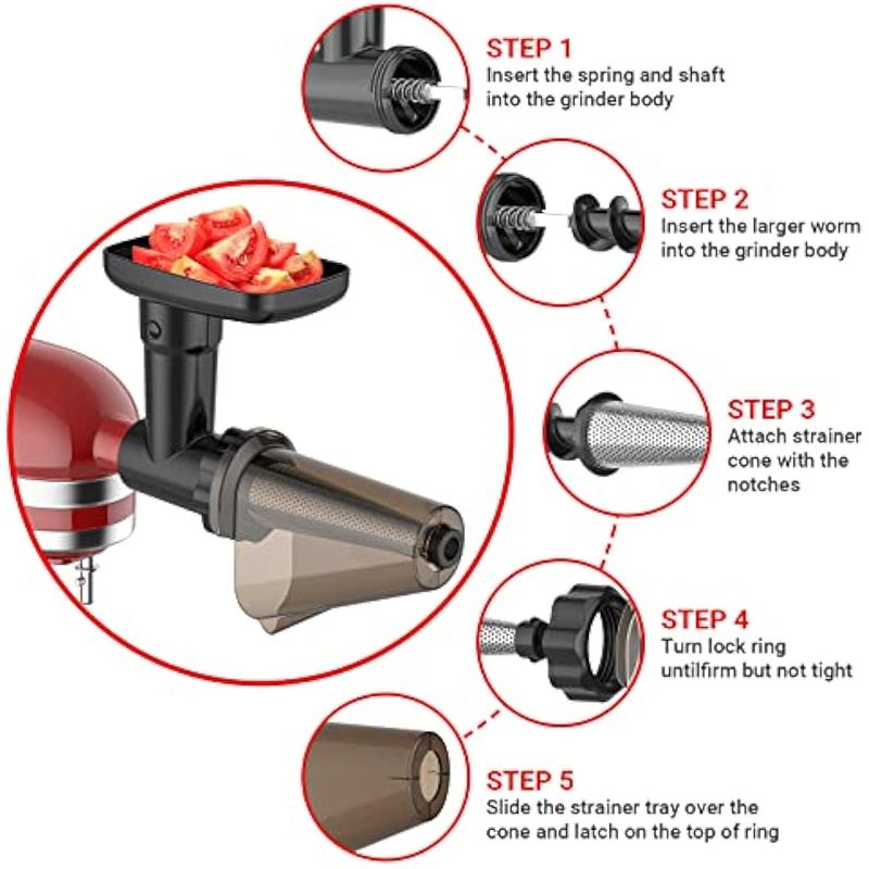 Fácil de limpiar: todos los coladores de frutas y verduras kitchenaid y el accesorio de picadora de carne de cocina para batidora de pie KitchenAid son extraíbles, aptos para lavavajillas o se limpian rápidamente en pocos minutos con jabón, agua tibia debe estar por debajo de 122 °F y el cepillo incluido. Con instrucciones integradas para una fácil operación, las recetas saludables, imprescindibles para el verano.