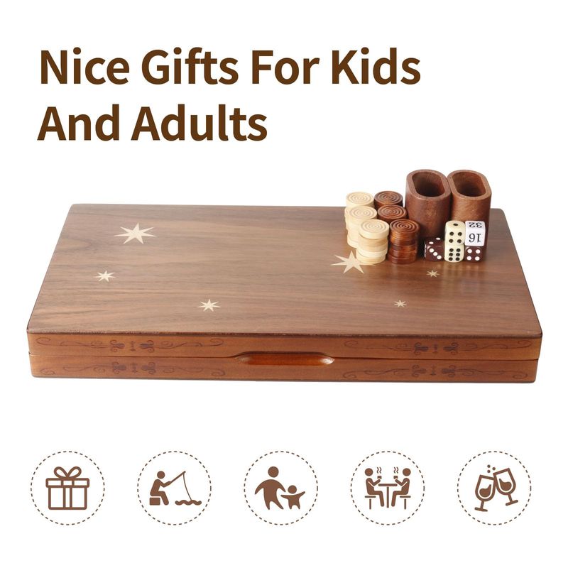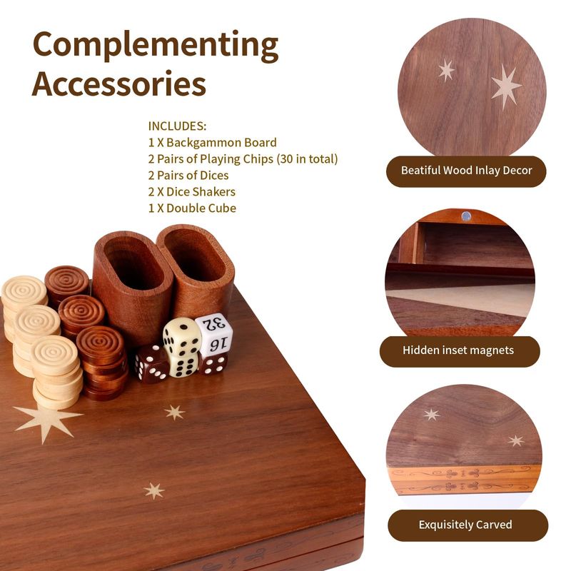 Material y artesanía de alta calidad: el tablero y las virutas están hechos de madera. Este juego es de primera calidad, desde la hermosa tabla de incrustaciones de madera hasta las cajas de dados de madera genuina. La calidad de la madera y el acabado del juego son excepcionales. La atención al detalle en los chips y accesorios de madera proporciona una sensación premium que realmente mejora la experiencia de juego.
