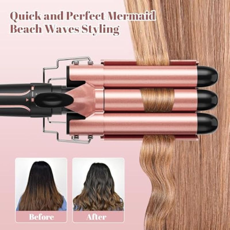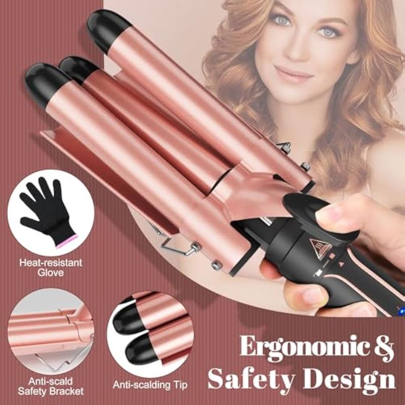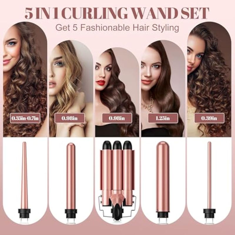 Personaliza fácilmente peinados: ¡prueba nuestros juegos de rizadores de 3 barriles y 4 rizadores! Crea ondas hermosas y voluminosas con el rizador de ondas de 3 barriles, perfecto para un estilo bohemio. Los 4 rizadores te permiten crear espirales apretadas u ondas sueltas, por lo que es perfecto para cualquier ocasión. Nuestra varita rizadora 5 en 1 viene con función de ajuste de temperatura ajustable de encendidoapagado, lo que te permite personalizar el nivel de calor de acuerdo con tu tipo de cabello y preferencias de peinado. No te preocupes más por el daño del cabello