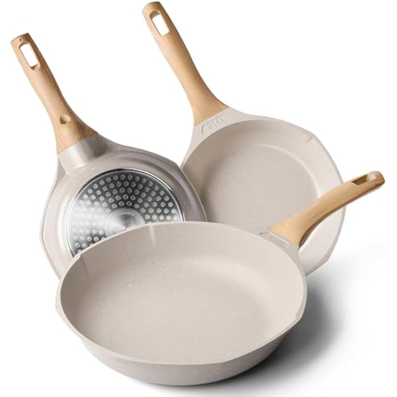 Juego de sartén antiadherente saludable: el juego de sartenes incluye una sartén de 8 pulgadas, una sartén de 9.5 pulgadas y una sartén de 11 pulgadas. Sin humo, verde y saludable, superficie muy duradera, gran efecto antiadherente, ideal para usar en calor bajo a medio. El elegante juego de utensilios de cocina satisface todas tus necesidades de cocina y familia.