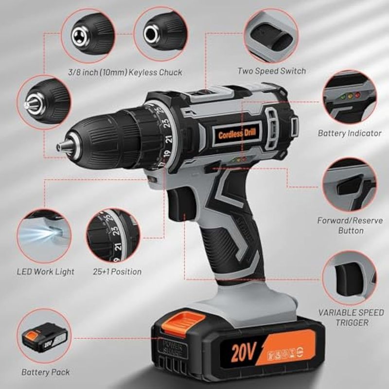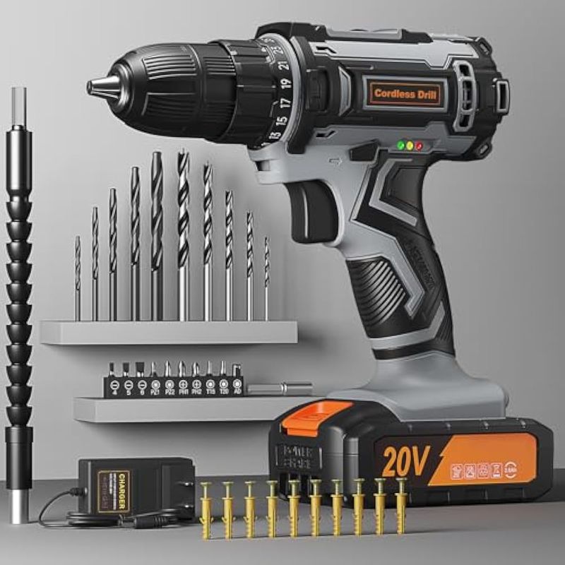 JUEGO DE TALADRO INALáMBRICO DE 20 V, TALADRO ELéCTRICO CON 42 ACCESORIOS Y BATERíA DE 2.0 AH, TALADRO ELéCTRICO 25+1 PAR DE TORSIóN, 2 VELOCIDADES, PORTABROCAS SIN LLAVE DE 3/8 PULGADAS, LUZ LED,
