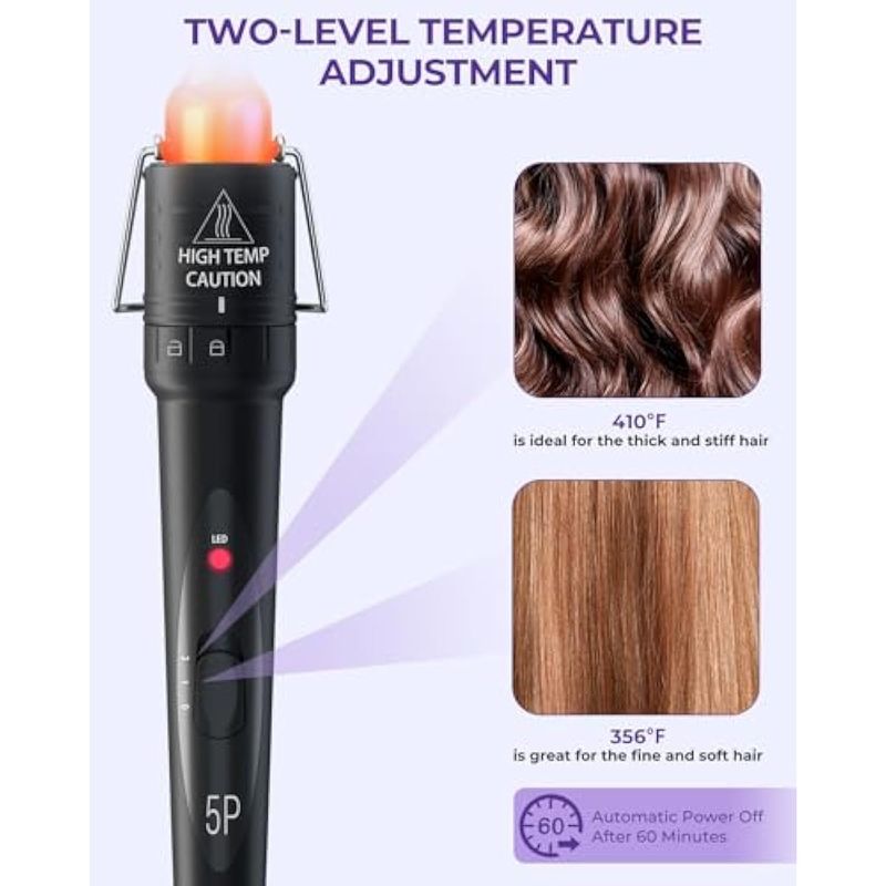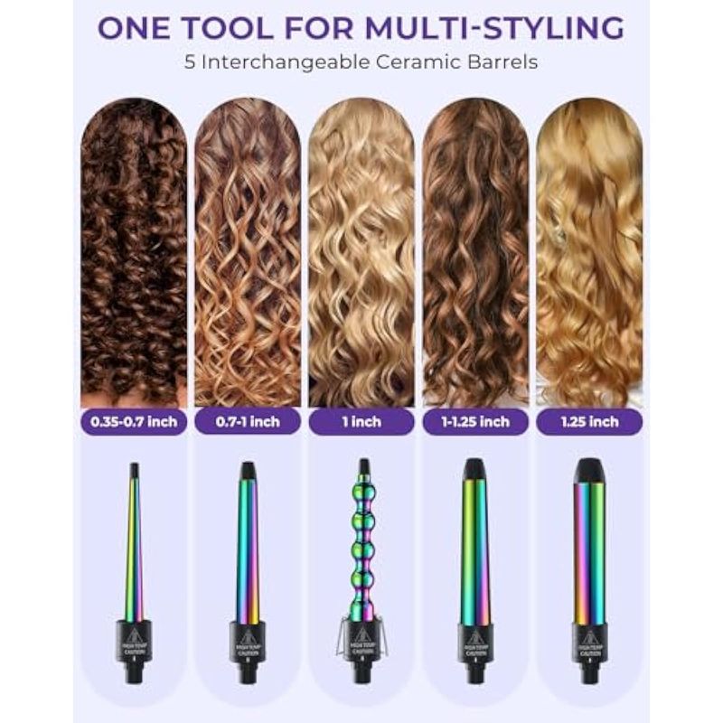 Juego de varita rizadora 5 en 1: ¡Consigue el hermoso cabello que siempre has querido sin correr al salón cada semana! Puedes hacer casi cualquier cosa con los 5 barriles de diferentes tamaños 0.35-0.7 pulgadas, 0.7-1 pulgada, 1 pulgada, 1 – 1.25 pulgadas y 1.25 pulgadas. Además, el doble voltaje universal de 110 V-240 V, 2 clips, el guante resistente al calor y el cable giratorio de 360° hacen que sea fácil de viajar, seguro y cómodo de usar.
