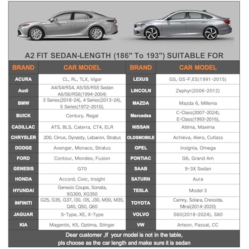 ?Dimensión A2?: ajuste universal para automóviles sedán cuya longitud es de 186 a 193 pulgadas. No compatible con automóviles hatchback y VUD. Adecuada para Toyota Camry, Honda AccordCivic, Nissan AltimaMaxima, Cadillac CT4, Kia K5OptimaStinger, Hyundai Sonata, Tesla modelo 3, Ford Fusion, Audi A4A5A6, BMW serie 56, Mercedes-Benz clase C, etc.