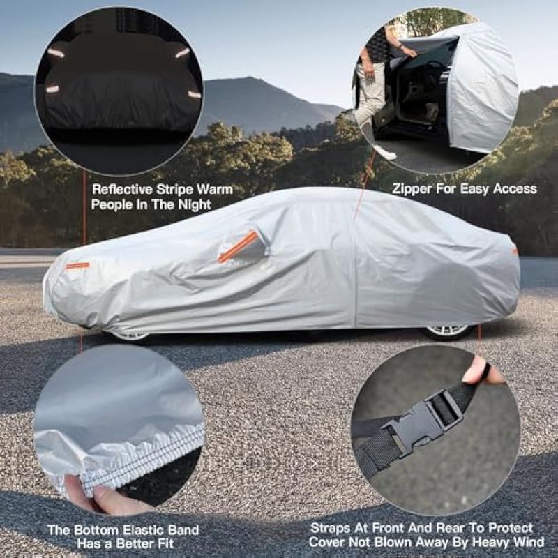 ?Diseño profesional?: 1. Cierre de cremallera para puerta del conductor para un fácil acceso. 2. Correas resistentes al viento en las partes delantera y trasera, para fijar la cubierta a tu automóvil en condiciones de viento intenso. 3. 6 tiras reflectantes, como recordatorio de visibilidad para los demás en la noche. 4. Bolsillos para espejo, que hacen que la cubierta se ajuste mejor a tu vehículo.