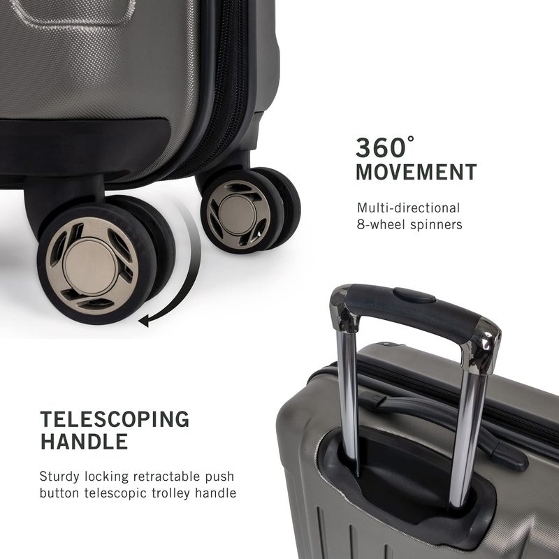 Manejo sin esfuerzo: i Los giradores multidireccionales de 8 ruedas permiten un movimiento suave de 360° sobre cualquier terreno para una movilidad total y sin peso ii cuatro patas laterales moldeadas que permiten que el equipaje se coloque de lado iii El mango telescópico retráctil con botón pulsador se extiende 41 pulgadas para brindar el máximo control y maniobrabilidad iv El exterior cuenta con una manija de agarre superior, inferior y lateral.