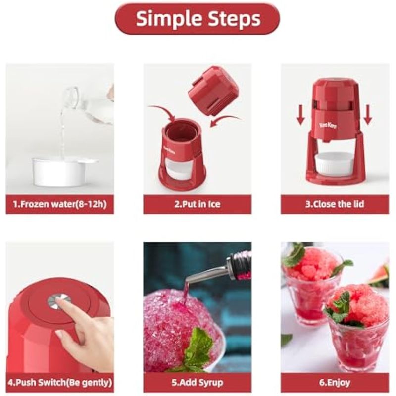 Fácil de usar: máquina de cono de nieve diseñada con un simple interruptor de presión, esta máquina de hielo afeitado portátil es fácil de usar para adultos y niños. Simplemente ponga hielo, presione suavemente y disfrute de conos de nieve caseros, granizados o helado en cuestión de segundos. Evita presionar demasiado fuerte para garantizar un funcionamiento suave y evitar resbalones.