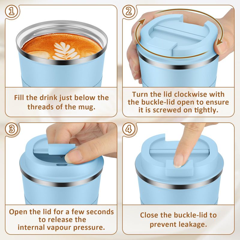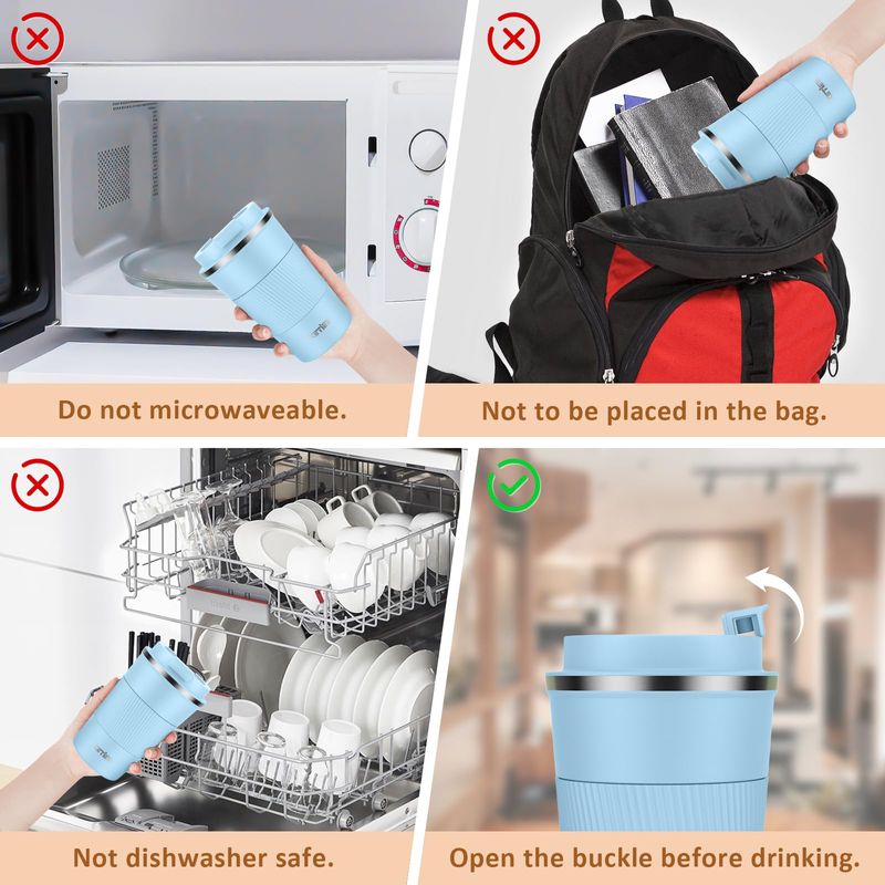 No se recomienda el lavavajillas: sin costuras en la pared interior del vaso de café y la boca de viaje de 3.35 pulgadas de ancho hacen que tu trabajo de lavado sea muy fácil. Solo necesita girar y desenroscar la tapa, colocar la taza de viaje de café debajo del agua corriente para enjuagar.