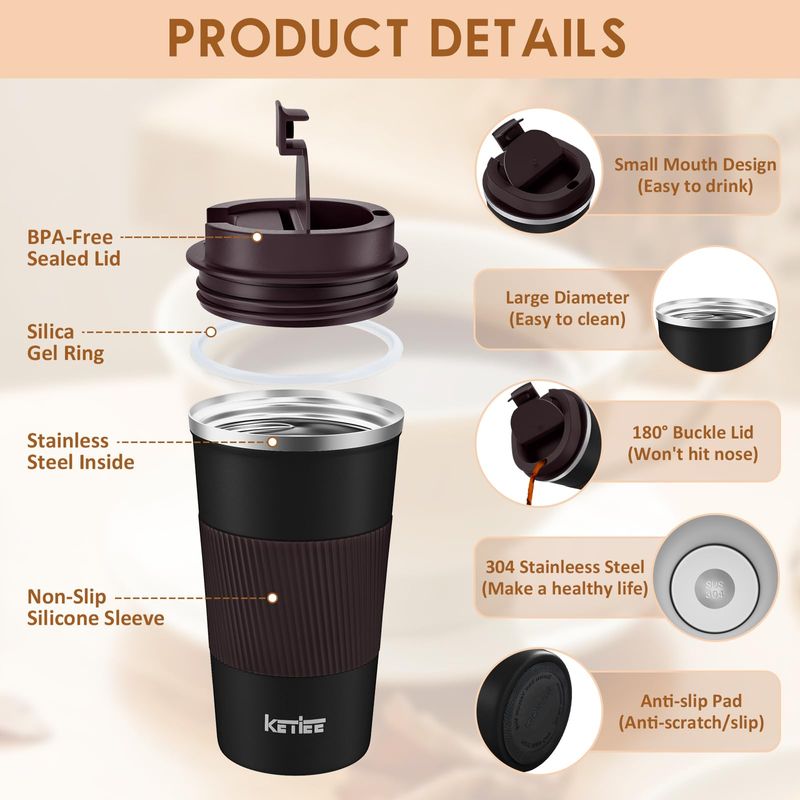 KETIEE Taza de viaje de 12 onzas, taza de café aislada con tapa a prueba de fugas, taza de café de