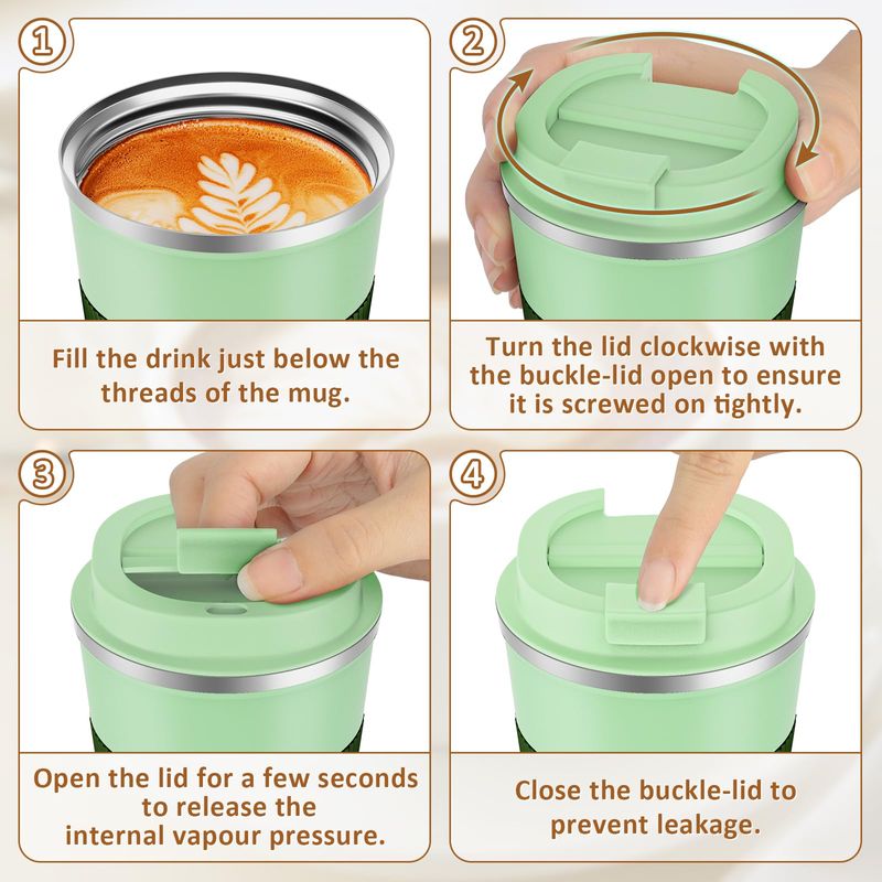 No se recomienda el lavavajillas: sin costuras en la pared interior del vaso de café y la boca de viaje de 3.35 pulgadas de ancho hacen que tu trabajo de lavado sea muy fácil. Solo necesita girar y desenroscar la tapa, colocar la taza de viaje de café debajo del agua corriente para enjuagar.