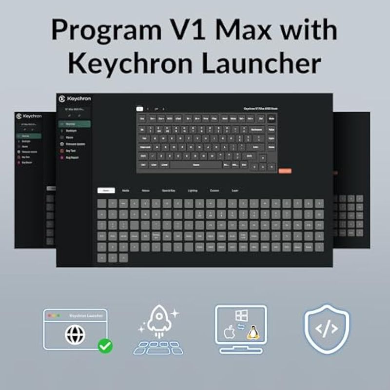 Remapea cualquier clave en el navegador web: simplemente conecta el V1 Max a tu dispositivo con un cable, abre la aplicación web Keychron Launcher, arrastra y suelta tus teclas favoritas o comandos de macro para reasignar cualquier clave en cualquier sistema macOS, Windows o Linux para un flujo de trabajo fluido. O cree su mapa de teclas con el firmware QMK de código abierto.