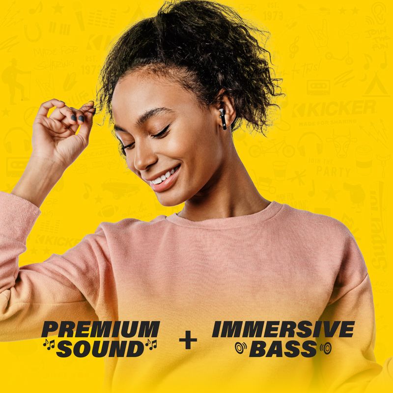 KICKER Sonido premium: disfruta de un sonido nítido durante las llamadas, ya que el avanzado micrófono ambiental con cancelación de ruido minimiza las perturbaciones de fondo, lo que permite una comunicación efectiva en cualquier entorno.